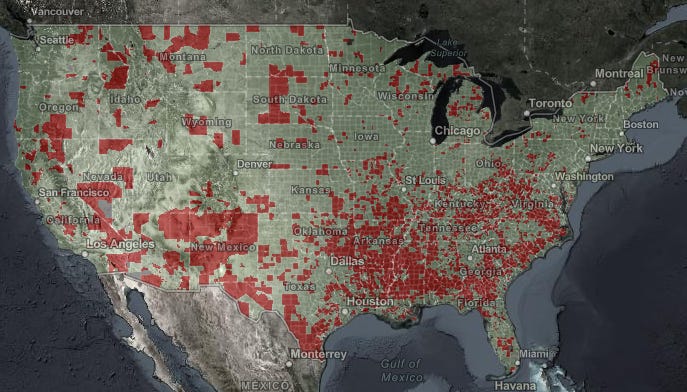 Each census tract contains between 1,200 and 8,000 people with an optimum size of 4,000. 4 The maps can be layered a variety of different ways, but no amount of data manipulation can obscure the reality that large portions of the country, particularly in the Deep South and Southwest, have no access to a utility Perspective readers don’t give a second thought. Here’s a link to the map if you want to try it out for yourself.